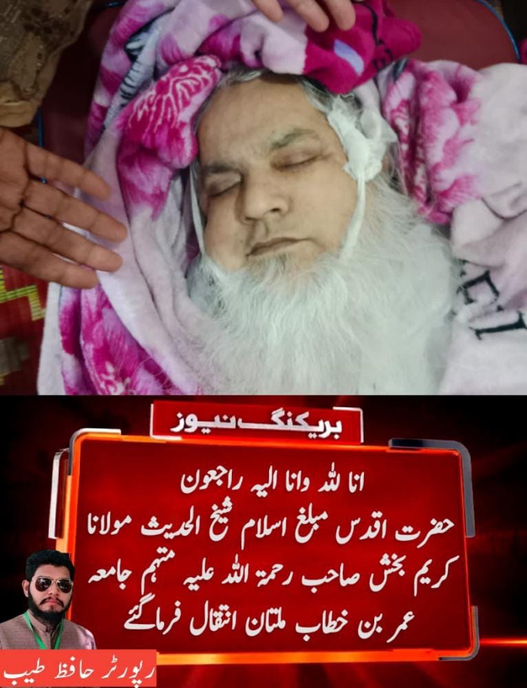 Pakistan tabligh Shura, top religious scholar, preacher, great teacher, respected Sheikh-ul-Hadith, preacher of Islam Hazrat Maulana Karim Bakhsh Sahib (Director of Jamia Umar bin Khattab Multan) has passed away last night about 5am. Inna Lillahi wa inna ilayhi raji’un.