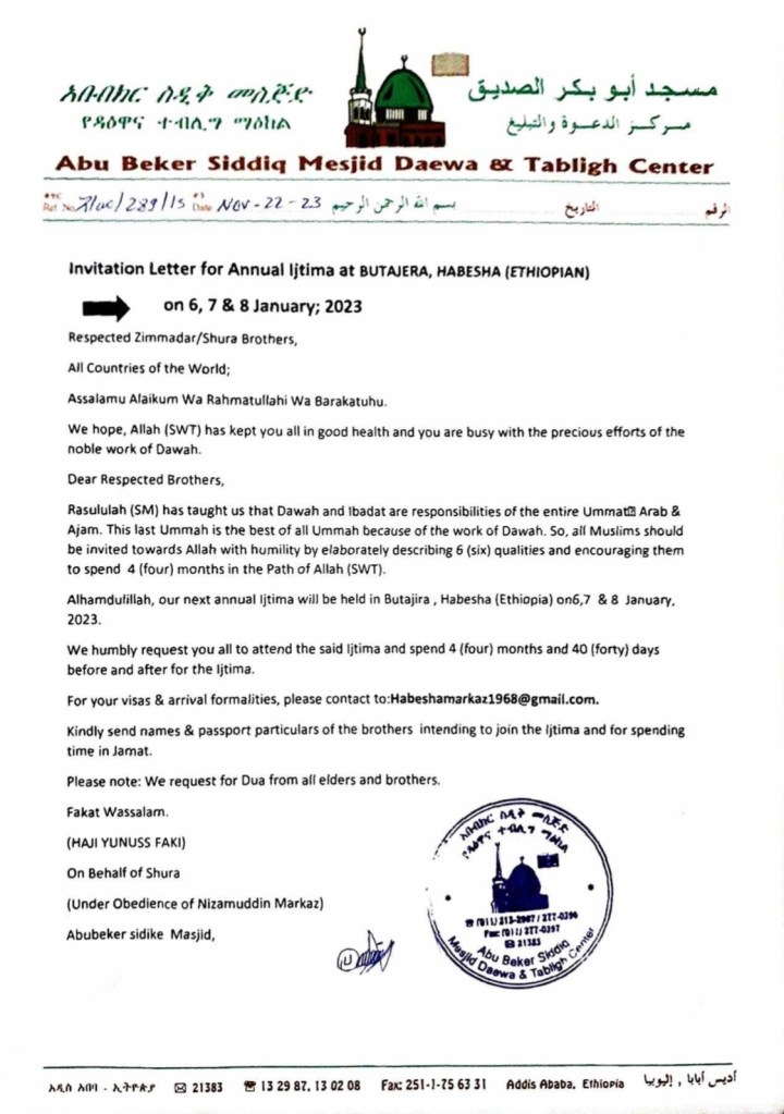 Upcoming Ijtema will commence on January 6, 2023 and ends on January 8, 2023 InshaAllah at BUTAJERA, HABESHA (ETHIOPIAN). It will be the second Annual Ijtema in Ethiopia. The First Ethiopia – East Africa Ijtema was concluded on 6th – 8th December 2019 in Butajira, Southern Nations. The Ethiopian Ijtema under the guidelines of World Markaz Nizamudidin, for this purposes Ethiopian Shura sent invitation letter.