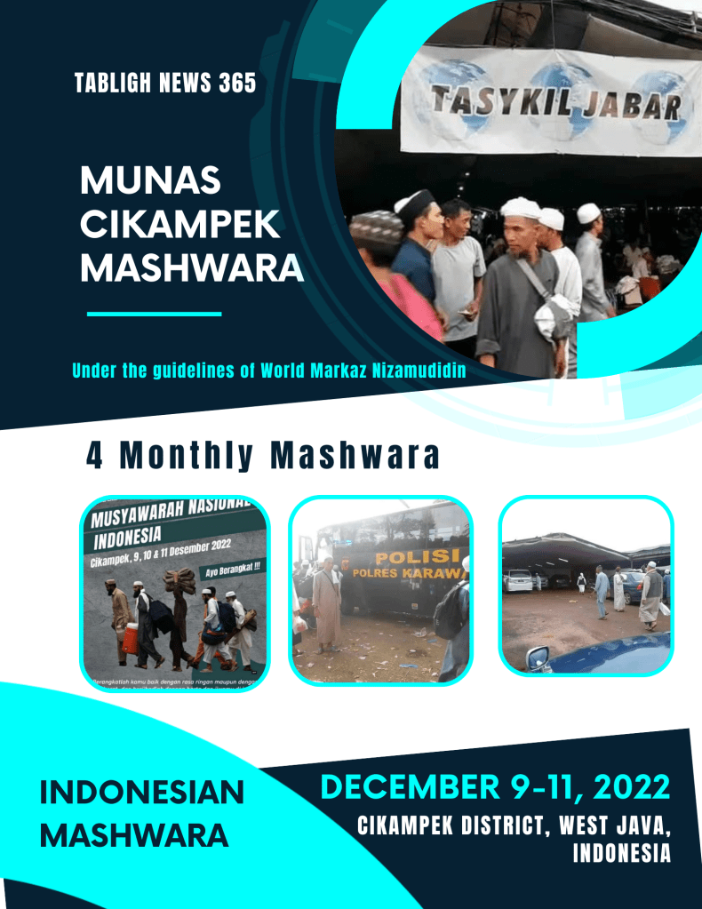 Alhamdulilla. Indonesian cikampek district, West Java 4 monthly Mashwara begins today on December 09, 2022 & ends on December 11,2022 at “Munas Cikampek” area, under the guidelines of World Markaz Nizamudidin.