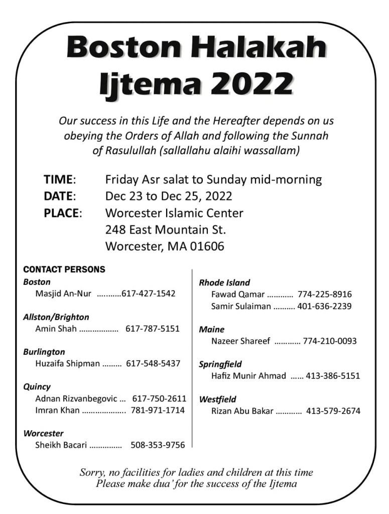 Ijtema began on December 23 and tomorrow will be final Dua InshaAllah. May Allah SWT reward all our overseas guests & Boston Halaqa’s brother for their sacrifices and accept all of us for the Deen and the effort of Deen. Ameen.