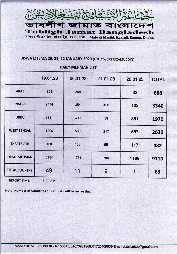 As of today total more than 14 thousand foreign guests attend the Ijtema. About 71+ countries are participated. Attached pages mentioned total 9,110 foreigners from 63 countries are participated. This number from Bangladesh Central Markaz Kakrail. This number only for the month of January, 2023, which was counted by passport. Those foreign brothers gave their passport to central Markaz & listed their name on the Markaz. Besides there are more than 5 thousand foreigners are not listed & they keeping their passport. Total foreigners number more than 14 thousand. Mostly foreigners started coming from the Month of November 2022. Huge numbers of foreigners spend 4,months, 40 days & also a lot of Ulama spend one year in Bangladesh. Those numbers are not counted.