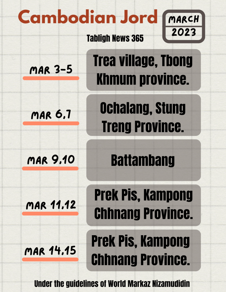 Alhamdulillah by the Grace of Allah subhanahu wa ta’ala (SWT), Cambodian 5 places Jord all over the Cambodia commencing from tomorrow (From March 03-15, 2023) InshaAllah. With the tremendous continuous efforts & Fikr, Cambodian National National Shura, Akabir from World Markaz Nizamudidin, Bangladesh elder Jamaat with Dr. Rafique Sahib, Malaysian elder & many countries Jamaat will be participating InshaAllah. May Allah SWT accept this efforts of Deen. Ameen.