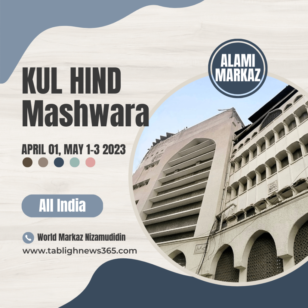 Alhamdulilla. Kul Hind Mashwara at Aalami Markaz Banglewali Masjid Nizamuddin Delhi will commence from April 30 to May 1-3, 2023 InshaAllah. This is the 3 (three) monthly Kul Hind Mashwara for All India.