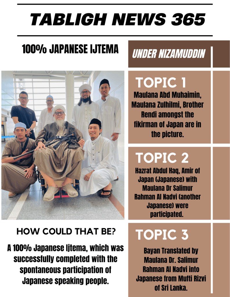 (1) Bayan Translated by Maulana Dr. Salimur Rahman Al Nadvi into Japanese from Mufti Rizvi of Sri Lanka. Maulana Dr. Salimur Rahman Al Nadvi is a Japanese & President of rukyatul hilal Japan. All Japanese Ulama, Hafiz & brothers are under the guidelines of World Markaz Nizamudidin. Malaysian Shura made a huge effort behind the success of Japan Ijtema, which concluded last May 21, 2023.