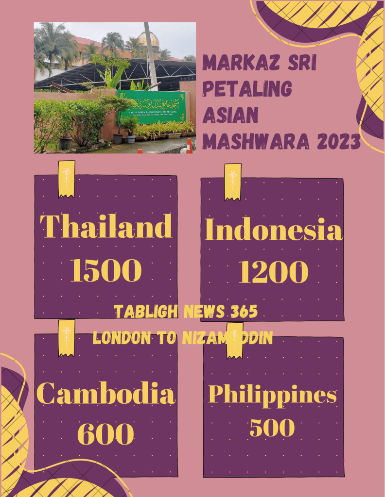 Thailand ๐น๐ญ, Indonesia ๐ฎ๐ฉ, Cambodia ๐ฐ๐ญ, Philippines ๐ต๐ญ are the most participating countries of Asian Mashwara. Thailand will sending top numbers of attendees near about 1500, Second Indonesia send near about 1200, Third Cambodia send near about 600 & Philippines will sending near about 500 attendees. Although there are many jamats ready at the moment, only a limited number of Jamaat can go due to Malaysian quota.