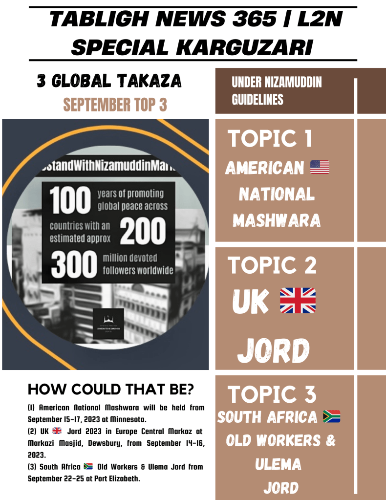 Alhamdulilla the Karguzari for the Month of September 2023. There are 3 biggest global gathering ahead in the month of September 2023, under the guidelines of World Markaz Nizamuddin.