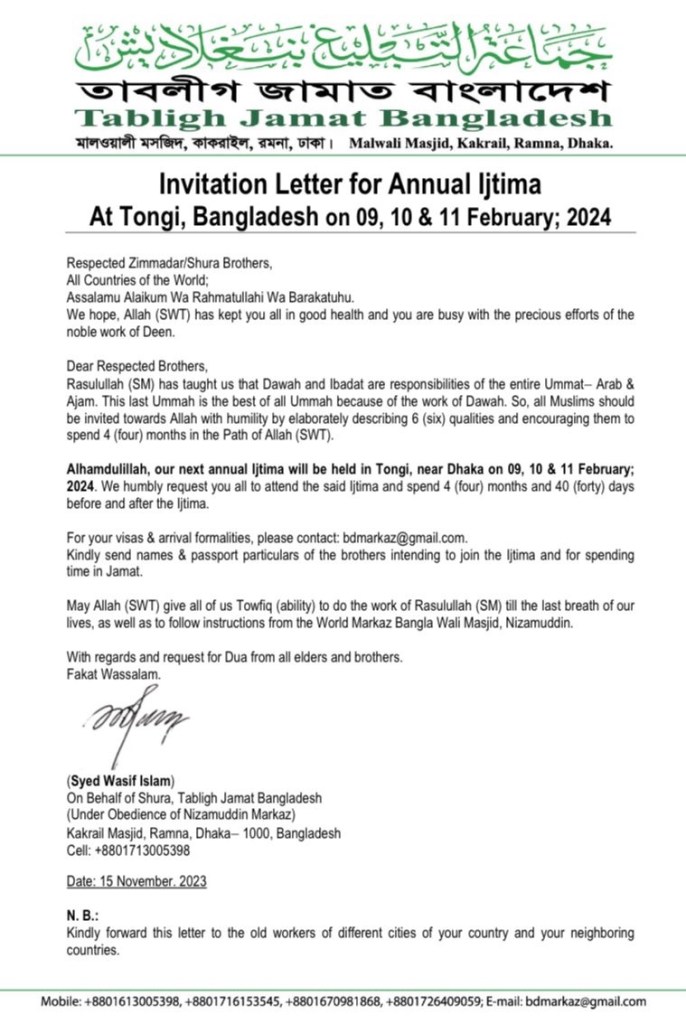 Alhamdulilla. Below the invitation Letter for Annual Ijtema at Tongi, Bangladesh on 09, 10 & 11 February; 2024.