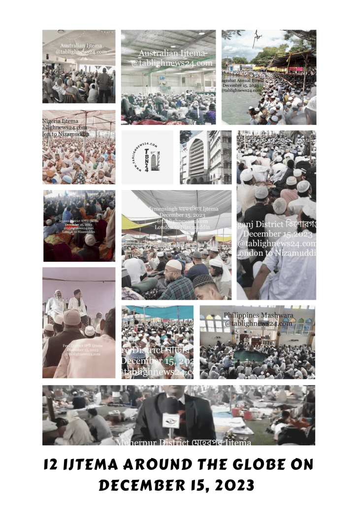 Alhamdulilla the Karguzari for around the World. As of today on December 15, 2023, under the guidelines of World Markaz Nizamuddin, following 12 Ijtema’s are taking place peacefully & successfully all over the Globe 🌎. There is Two Ijtema in Australia 🇦🇺, One Ijtema is in India 🇮🇳, Seven Ijtema in Bangladesh 🇧🇩, One Ijtema in Nigeria 🇳🇬, One Mashwara in Philippines 🇵🇭. It’s to be noted that the month of December 02, 2023 there was 17 Ijtema, which was the highest one day record. Link: https://tablighnews24.com/2023/12/02/new-record-on-the-december-02-2023-in-the-history-of-nizamuddin-markaz-the-highest-number-of-ijtema-jord-mashwara-are-taking-place-in-a-single-day-around-the-globe-17-biggest-gatherings-ar/