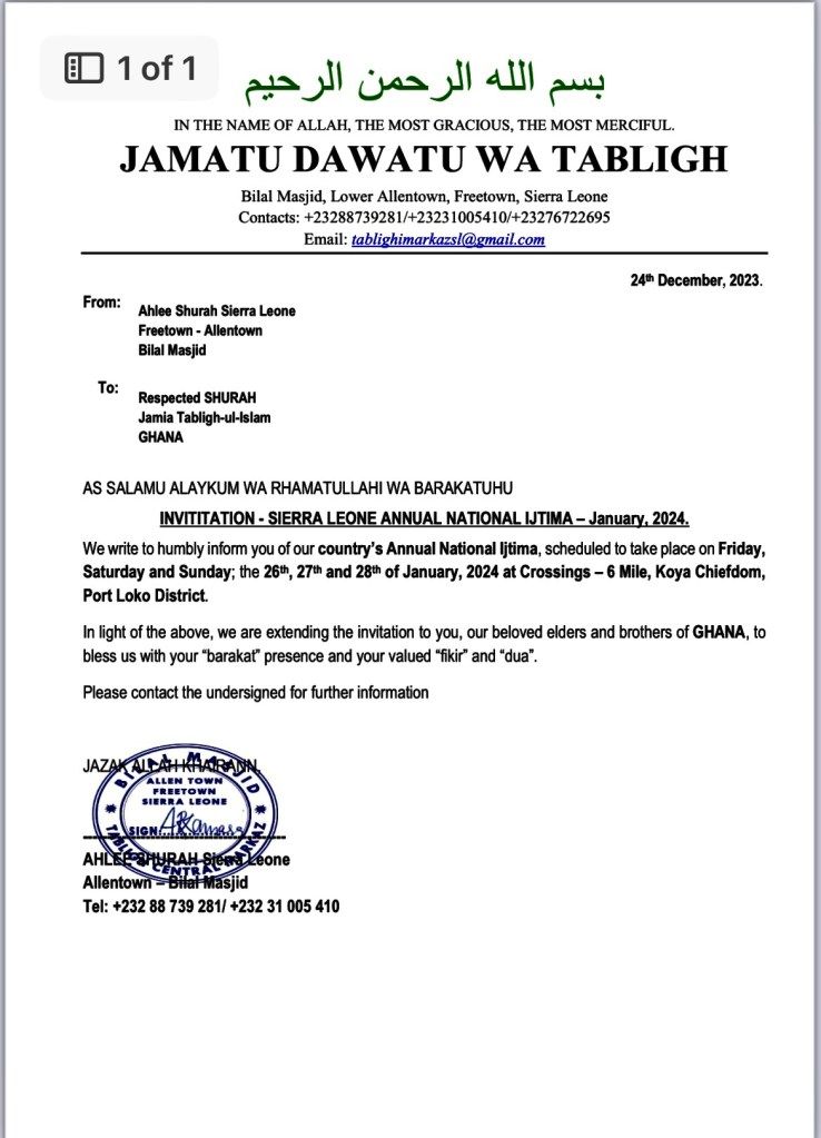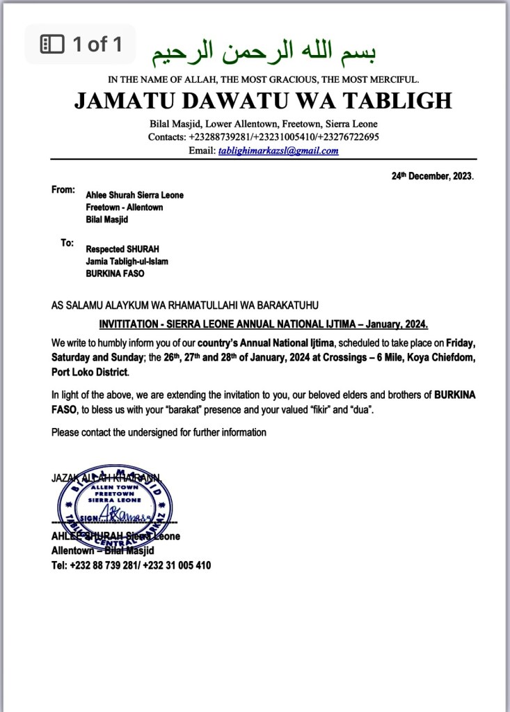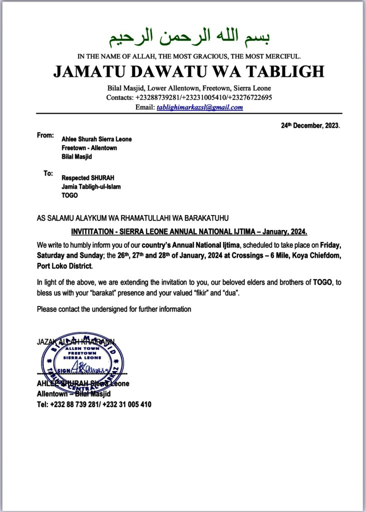 Alhamdulilla the Karguzari of Sierra Leone, Country in West African upcoming Ijtema, which is scheduled to be held from January 26,27,28 2023.