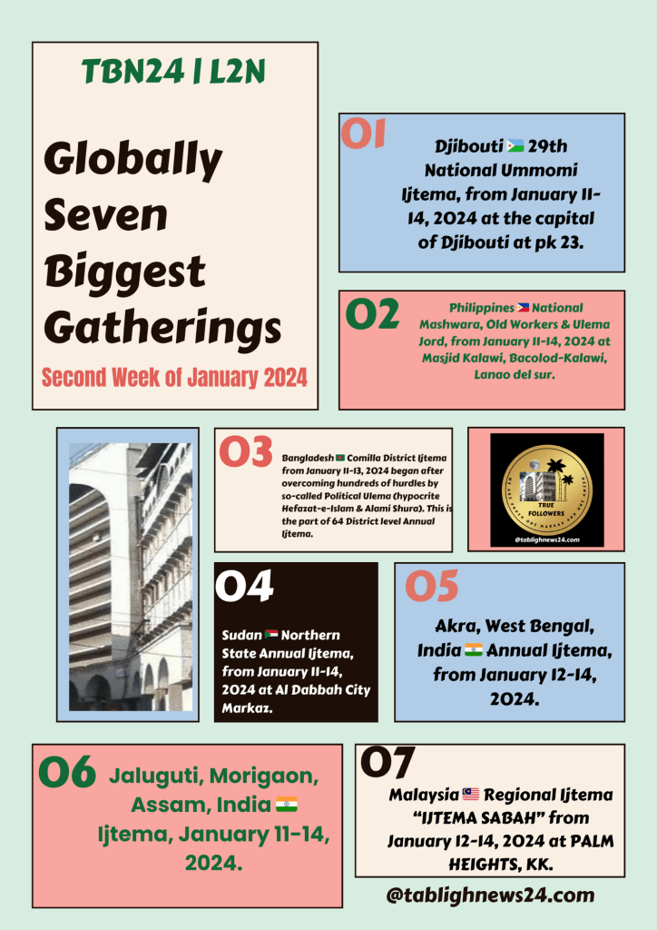 Alhamdulilla the Karguzari of Second Week of January 2024. Below Seven Biggest Events in around the world are commencing at the same day thatโs the second week/weekend of January 2024 under the guidelines of World Markaz Nizamuddin.