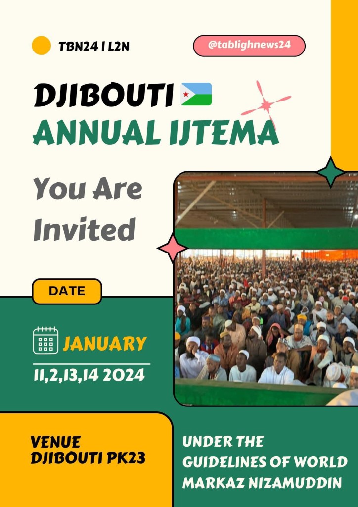 Alhamdulilla. The annual Ijtima event in Djibouti, organized under the direct supervision of Ulema, Nizamuddin, India ๐ฎ๐ณ, Tabligh preaching movement, holds a special significance in our region. Began from Thursday, January 11, 2024 & ends on Sunday, January 14, 2024, at Pk23, this event brings together participants from various regions of the country in Djibouti ๐ฉ๐ฏ and abroad. Moreover 60,000 local Ahabab including Jamaat from India ๐ฎ๐ณ Nizamudidin, Pakistan ๐ต๐ฐ, Bangladesh ๐ง๐ฉ, Ethiopia ๐ช๐น, Somalia ๐ธ๐ด, Sudan ๐ธ๐ฉ, Congo, Saudi Arabia ๐ธ๐ฆ, Sri Lanka ๐ฑ๐ฐ, Kenya ๐ฐ๐ช & Neighboring Countries are attending. About 18 Countries Jamaat are attending.