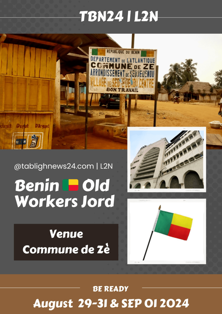 Benin was a French colony. Estimated 24.6% of Benin’s population is Muslim. It is the Country in West Africa. Venue Zรจ is a town & community in the Atlantique Department of southern Benin ๐ง๐ฏ. It’s bordered by Togo ๐น๐ฌ to the West, Nigeria ๐ณ๐ฌ to the East, Burkina Faso ๐ง๐ซ to the North-West & Niger ๐ณ๐ช to the North-East. The Majority of Population lives on the Southern Benin ๐ง๐ฏ where the Old Workers Jord will be held. May Allah SWT accept & bless. Ameen.