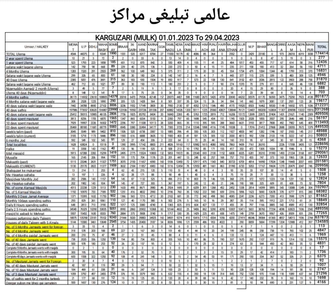 Alhamdulilla. Below is the Kul Hind Alami Mashwara (All India) Karguzari from January 01, 2023 to April 29, 2023. Kul Hind Mashwara began on April 30, 2023 & ends on May 02, 2023 after Jhur Salat InshaAllah. All India 28 states, 766 districts Tablighi Zimmadar Sathi’s are participating for this noble Mashwara. May Allah SWTContinue reading “Kul Hind 4 Monthly Karguzari | All India”