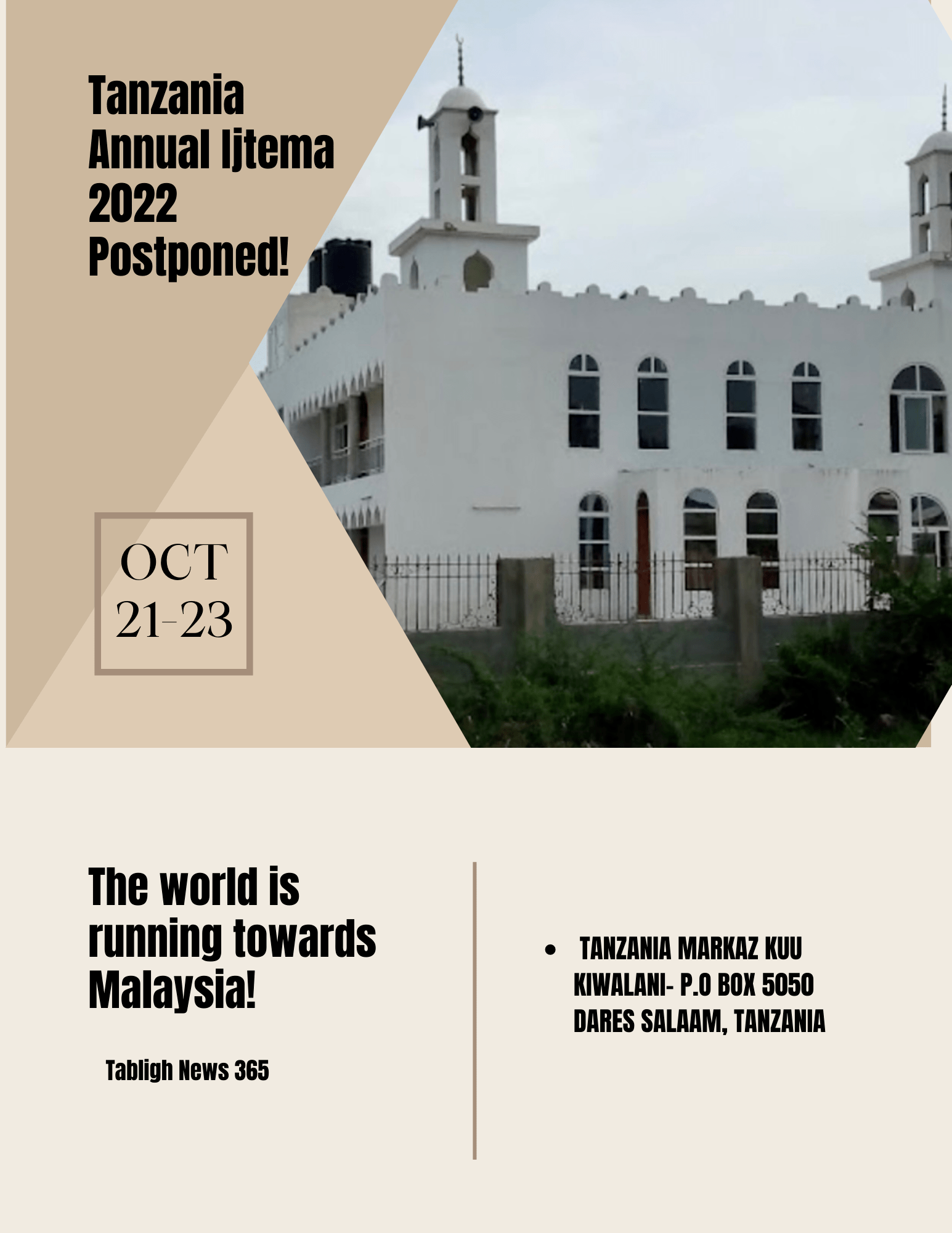Tablighi Zimmadar brothers from all over the world are rushing towards Malaysia, focusing on Hazratji’s visit to Malaysia. World Muslims have been waiting for last 4 years to see beloved Hazratji and hear his advice, but the numbers of attending in Malaysia is very limited by the Mashwara. Malaysian Ijtema dates and Tanzania’s Ijtema datesContinue reading “Tanzania Annual Ijtema 2022 Postponed!”