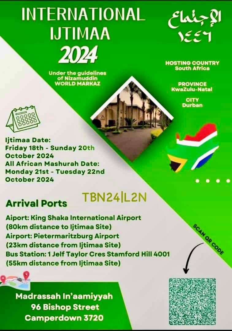 Alhamdulilla the Karguzari of Upcoming International Ijtema 2024. Only 57 Days Left for this upcoming Historic Worldwide Biggest Event. At a Glance of this Historic Event by Tabligh News 24: (1) Hosting Country: South Africa 🇿🇦 (2) Province: KwaZulu-Natal: (3) City: Durban (4) Venue: Madrassah In’aamiyyah, Camperdown (5) Ijtema Date: Friday 18th – Sunday 20thContinue reading “Only 57 Days for International Ijtema South Africa | World Amir Next Visit”
