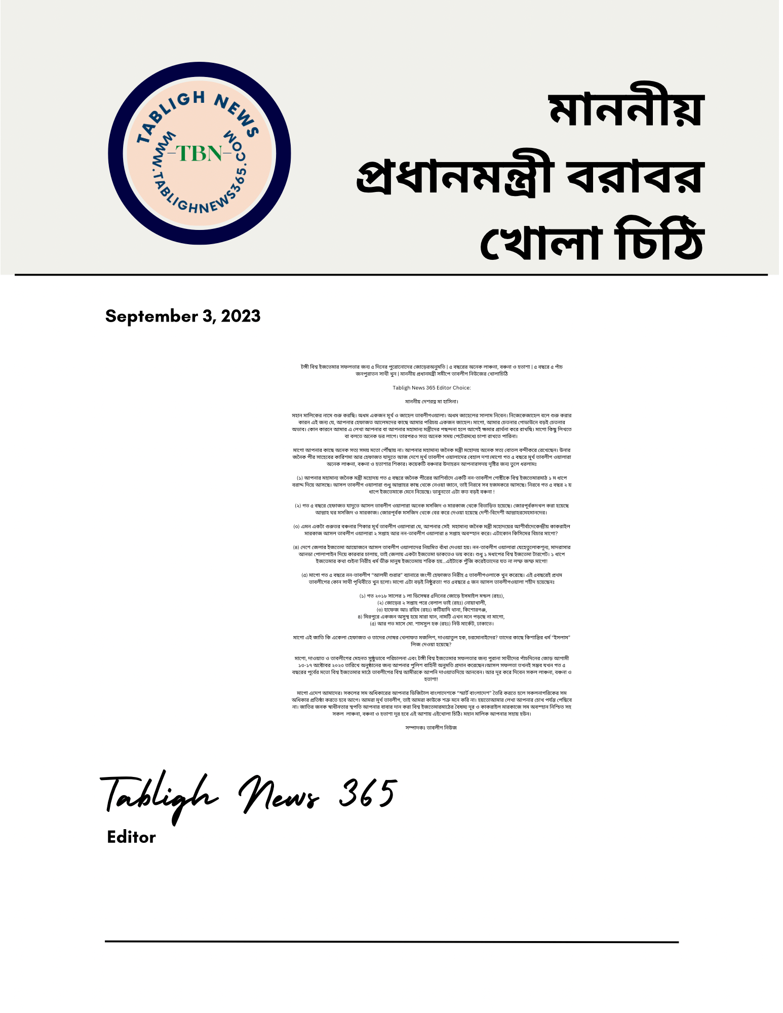 Tabligh News 365 Editor Choice: মাননীয় দেশরত্ন মা হাসিনা। মহান মালিকের নামে শুরু করছি। অধম একজন মূর্খ ও জাহেল তাবলীগওয়ালা। অধম জাহেলের সালাম নিবেন। নিজেকে জাহেল বলে শুরু করার কারন এই জন্য যে, আপনার হেফাজত আলেমদের কাছে আমার পরিচয় একজন জাহেল। মাগো, আমার চেতনার গোডাউনে বড়ই চেতনার অভাব। কোন কারনে আমার এ লেখা আপনার বাContinue reading “টঙ্গী বিশ্ব ইজতেমার সফলতার জন্য ৫ দিনের পুরোনোদের জোড়ের অনুমতি | ৫ বছরের অনেক লাঞ্চনা, বঞ্চনা ও হতাশা | ৫ বছরে ৫ পাঁচ জন পুরাতন সাথী খুন | মাননীয় প্রধানমন্ত্রী সমীপে তাবলীগ নিউজের খোলা চিঠি !”