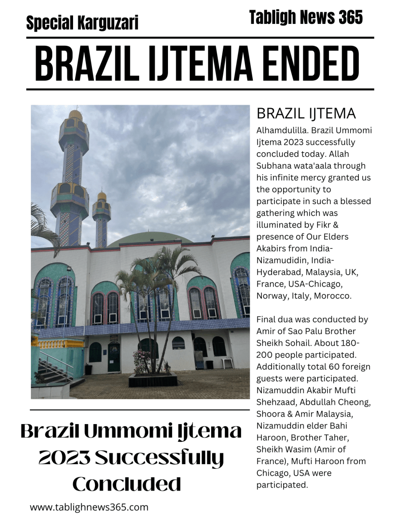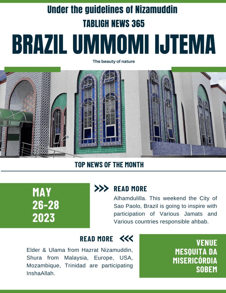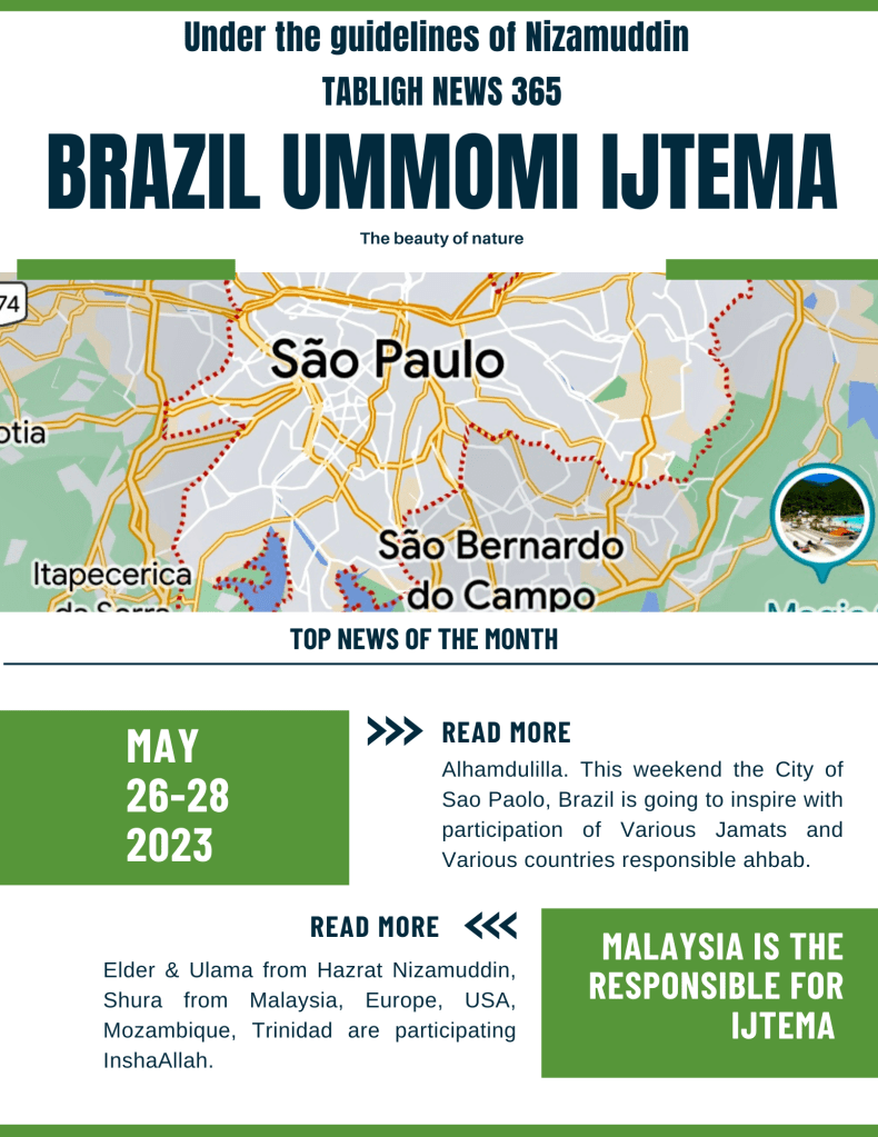 Alhamdulilla. After successfully concluded Japanese Ijtema, it is the another top Karguzari of the month of May. Brazil Ummomi Ijtema in Sao Paolo begins tomorrow on May 26, 2023 and ends on May 28, 2023 followed by dua inshaAllah.