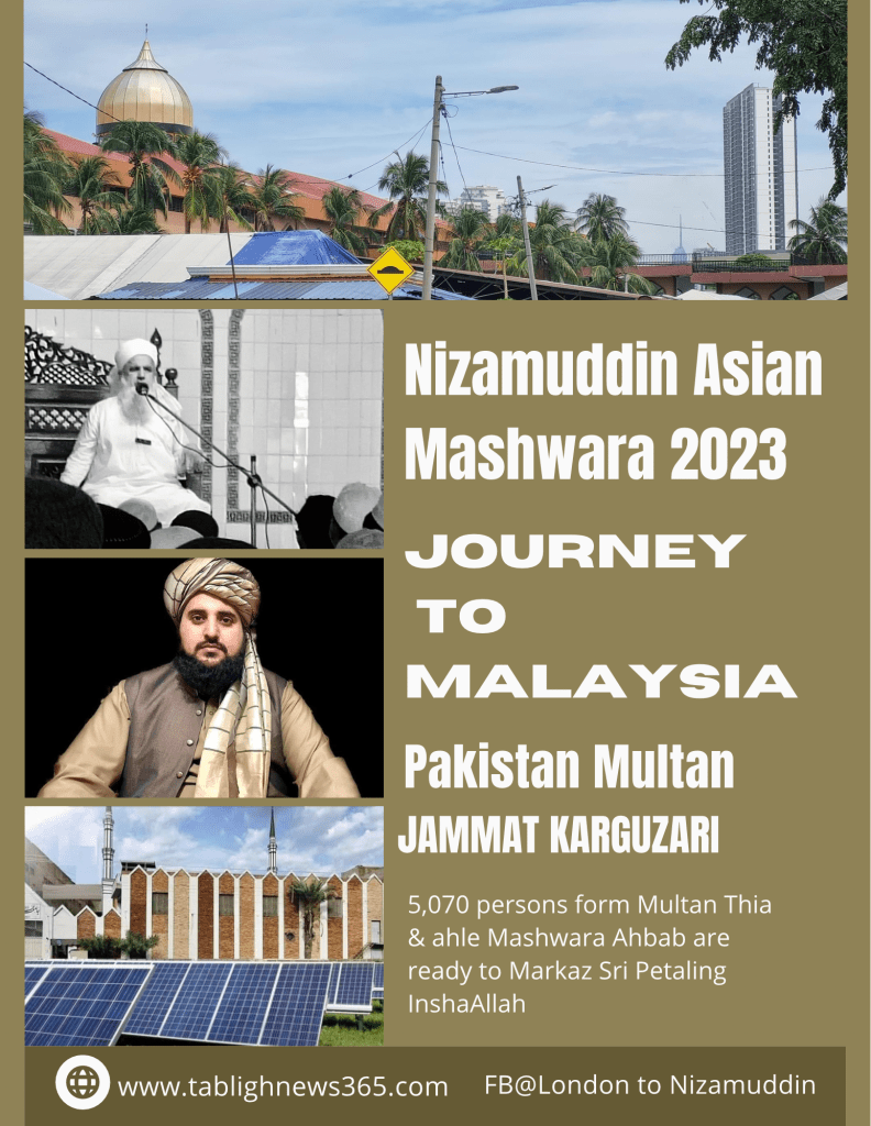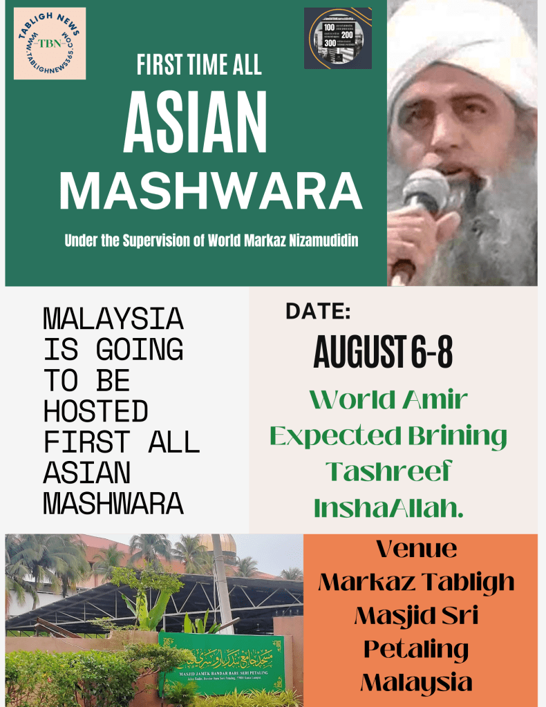 Alhamdulilla. By the mercy of Allah SWT, this is the first time in all Asian Nizamuddin Mashwara is going to be held in Markaz Tabligh Masjid Sri Petaling Malaysia from August 6-8, 2023 InshaAllah. World Tablighi Amir Hazrat Ji Ra’abe Muhammad Sa’ad Kandhlawi db expected bringing Tashreef InshaAllah. May Allah SWT accept & bless. Ameen.