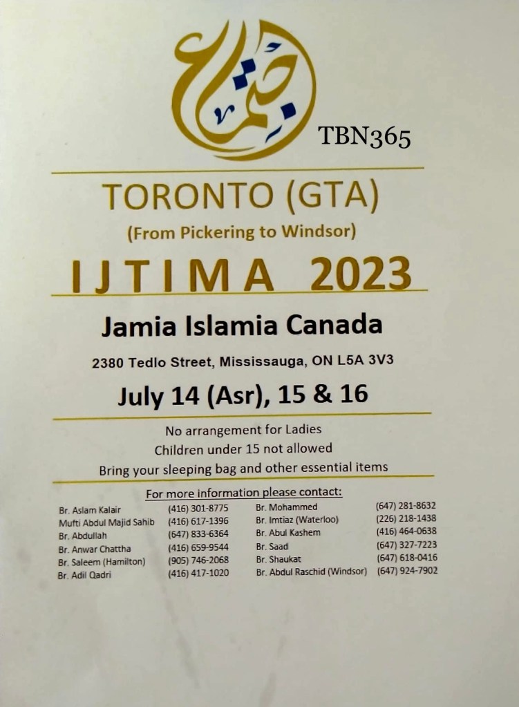 (2) Toronto, Canada Annual Ijtema: July 14-16 2023 at JAMIA ISLAMIA, CANADA.