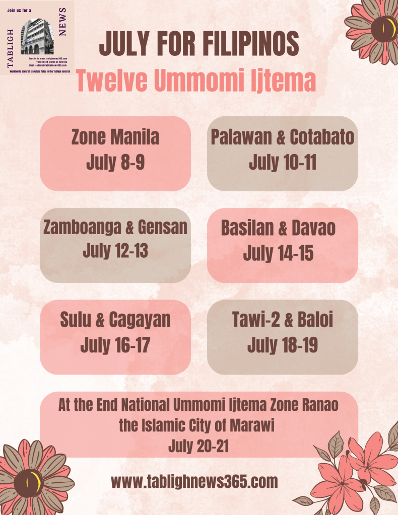 Alhamdulilla. This is the Karguzari from Philippines. The Month of July is the Month of Ijtema for Filipinos Muslims. There will be twelve Ummomi Ijtema all over the 12 Zone in Philippines in the month of July 2023 InshaAllah. The 1st Ijtema will be held from July 8-9 2023 at the Zone Manila under the guidelines of World Markaz Nizamuddin. Already Jammat from Nizamuddin India, Bangladesh, Indonesia, Brunei, Malaysia, Thailand are working for this purposes.