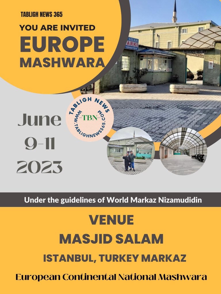 Alhamdulilla. European Continental National Mashwara at Turkey Istanbul Markaz will commence on June 09, 2023 & ends on June 11, 2023 followed by dua. Elder from Nizamudidin, Continental Europe & Arab Countries will participate InshaAllah.