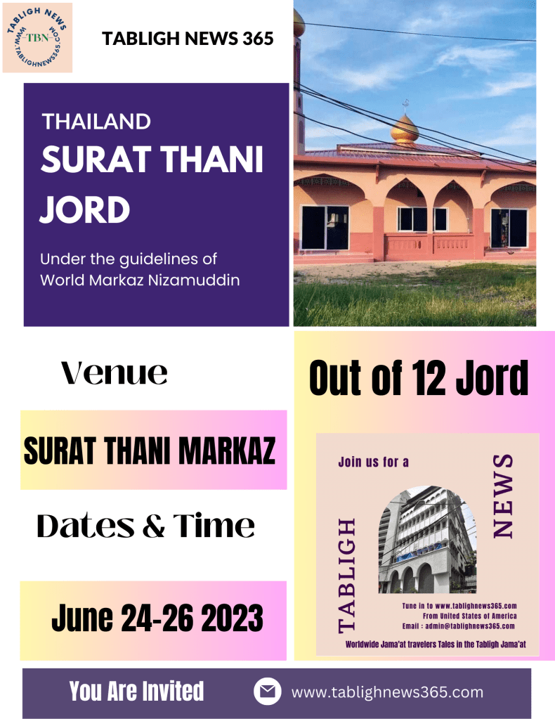 Alhamdulilla. Surat Thani province Jord began on June 24, 2023. The second day concluded. After 4-5 hours later on June 26, 2023 will be the final dua. Venue Surat Thani Markaz Masjid in Thailand are fully packed. It is the 6th Jord out of 12 Jord in Thailand in the Year of 2023. May Allah accept all Jord in Thailand. Ameen.