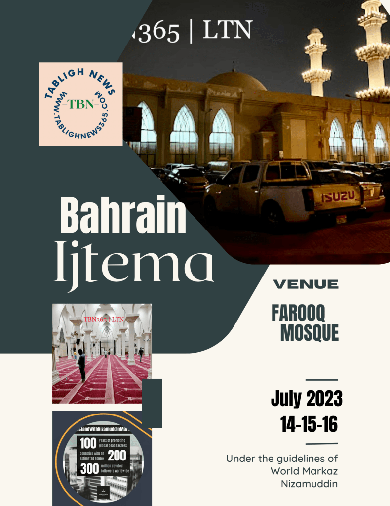 Alhamdulilla. By the grace of Almighty the Country in the Middle East Bahrain is going to be held its annual Ijtema from July 14-15-16 2023 at the Bahrain Markaz Masjid “Al Noor Mosque” in the capital of Manama City @ Riffa, Bahrain InshaAllah under the guidelines of World Markaz Nizamuddin. Elder from Nizamuddin, Arab, Bangladesh also going to participate InshaAllah. May Allah SWT accept & bless. Ameen.