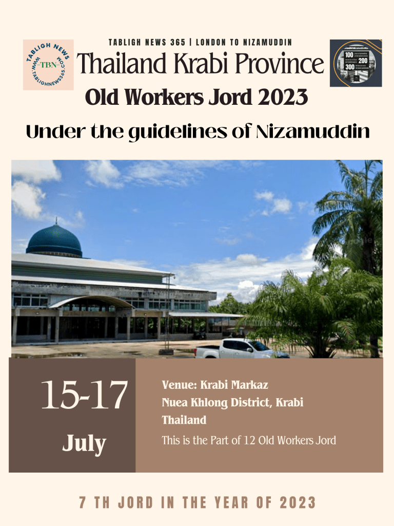 Alhamdulilla. Thailand is going to organize its number 7th Old Workers Jord, out of 12 Jord in the Year of 2023 InshaAllah, which will be a small gathering. It’s not including Twenty Two Biggest Ijtema in the Month of July. 35% Muslim populated Southern Province Krabi Old Workers Jord will be held from 15-17 July 2023 at Krabi Markaz InshaAllah. It’s to be noted that this Markaz is 100% under the guidelines of World Markaz Nizamuddin. May Allah SWT accept & bless. Ameen.