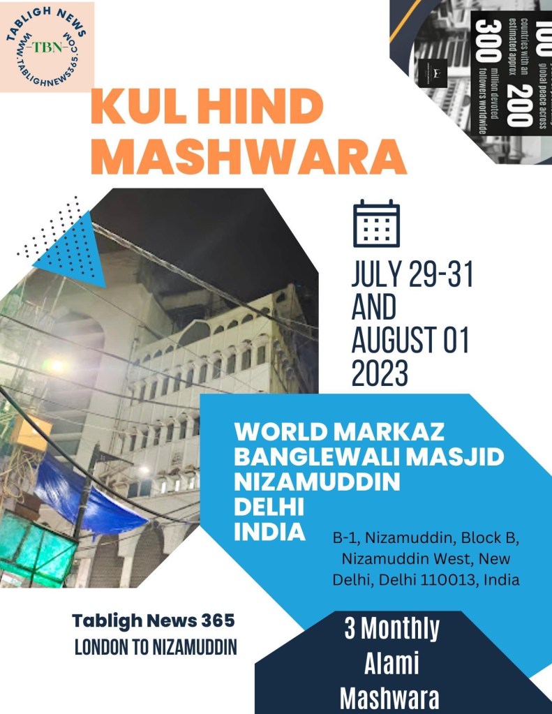 Alhamdulilla. Kul Hind Mashwara at Aalami Markaz Banglewali Masjid Nizamuddin Delhi will commence from July 29-31 & August 01, 2023 InshaAllah. Last Mashwara was held on April 30 to May 1-3, 2023. This is the three monthly Kul Hind Mashwara for All India.