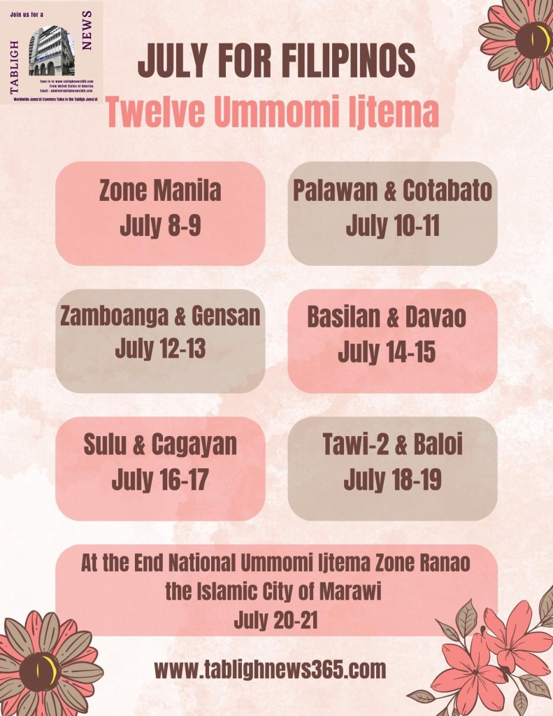 Alhamdulilla. By the grace of Almighty, upcoming July brings more blessing for the Filipinos Muslim. The Month from July 8-21 2023 Total 12 Ummomi Ijtema will commence all over the Philippines. Philippines tabligh work divided into 12 Zones. Each Zone have its own Ummomi Ijtema. The Final & National Ummomi Ijtema will commence Zone Ranao, which is the Islamic City of Marawi. Below 12 Zones Ijtema index. Jamaat from World Markaz Nizamuddin India, Malaysia, Indonesia & Bangladesh are going to participate InshaAllah. May Allah accept & bless. Ameen.