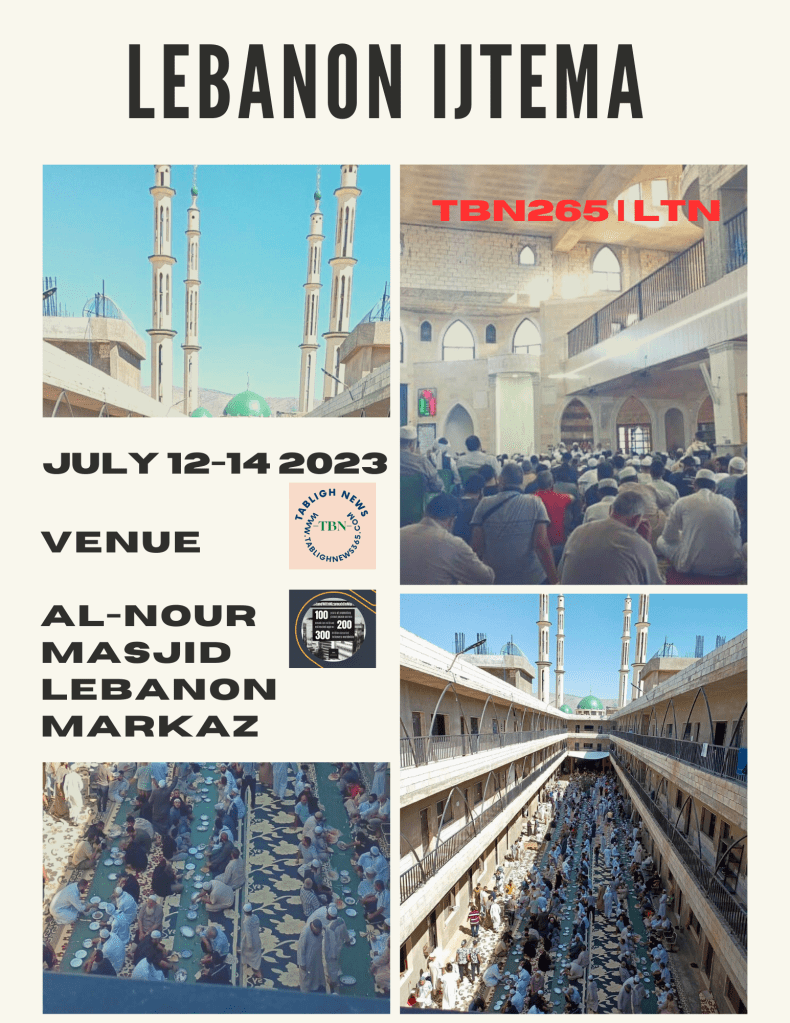 Alhamdulilla. This is the Lebanon upcoming Ijtema Karguzari. Last year Ijtema was huge crowded, which was concluded July 21-24 2022. Nizamuddin elders Jammat was participated. This year no Nizamuddin Jammat, even no foreign Jammat & it will be a small gathering. Only Lebanon’s people are going to participate. Ijtema will be held from July 12-14, 2023 InshaAllah at the Lebanon Markaz @ Al-Nour Masjid, Bar Elias, Beqaa, 51267. May Allah SWT accept & bless. Ameen.
