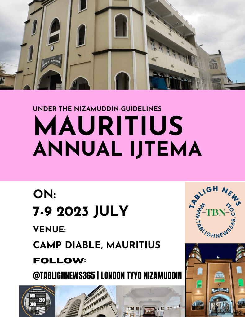 Alhamdulilla. East African Country Mauritius annual Ijtema begins today July 07, 2023 & ends on July 09, 2023 followed by Duaa InshaAllah. Duaa & Mustafa will conducting by Nizamuddin Elder Hazrat Maulana Shafi Sahib db.