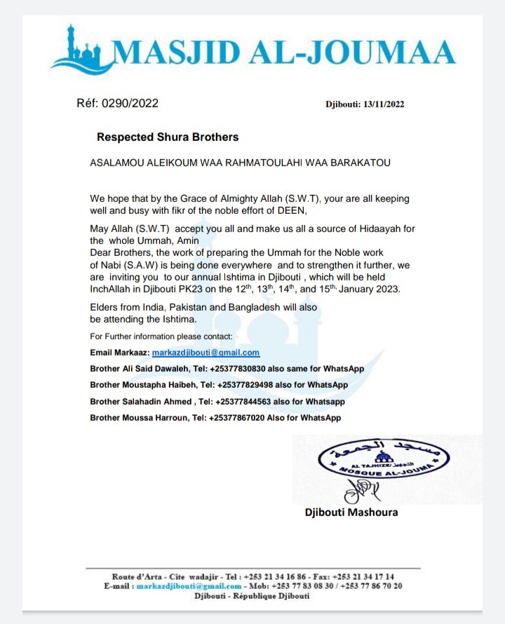 Our Elders from World Markaz Nizamudidin, India, Bangladesh & Pakistan Jamats will be attending the Ijtima InshaAllah. Diibouti Shura already sent invitation letter for this purposes.