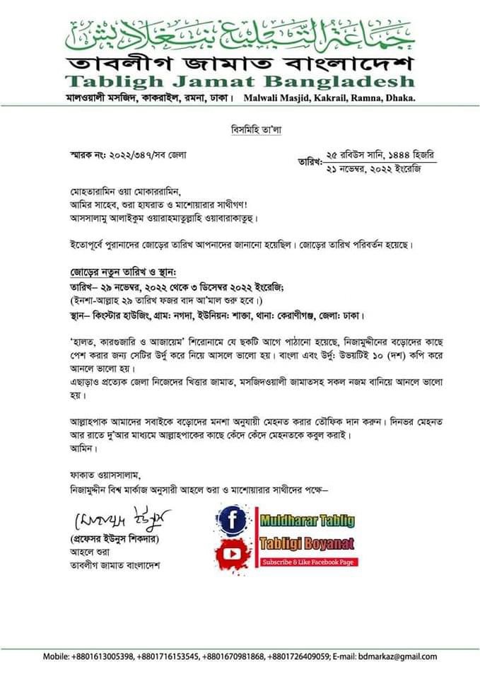 The 5 days of Tabligh Jamaat Jord is going to be a victim of the country’s dirty politics! In order to complete the Biswa Ijtema beautifully and successfully, Jord is organized for five days at least 40 days before the Biswa Ijtema every year. Only tablighi brother who had spent 40 days, 4 months and 1 year participate in this five-day Jord. Since last year 2018, innocent tablighi followers have not been able to properly perform their Jord and Ijtema in Bangladesh according to the guidelines of Central Markaz Nizamudidin, India. Somehow they are being harassed. Sometimes by religious political parties or by country’s biggest political parties. Believing in the belief that “Allah is One, and He is the doers” they silently & digest everything. Taking advantage of their weakness, the political parties of the country’s cheat with them. They forget that this large group of innocent Tablighi followers are citizens of the country. They have the right to vote. Due to the threat of two major political parties to occupy Dhaka on December 10 and the political unrest in the country, the innocent Tablighis have to pay the price. As it has been paid many times since last 2018. Seems Dhaka turn into a battlefield on December 10. Biggest Political Parties won’t ‘seize’ Dhaka on 10 December Inshallah. It’s the will of Allah SWT. So why innocent Tablighi have to pay the price? How long will the country’s political parties make as foolish to the innocent Tablighis? As from last 2018, Alami Shura being given priority to perform Ijtema in the first phase. Now it’s to be forced them stay in Keraniganj instead of Dhaka! To make foolish easy to Innocent Tablighi ! They accept everything easily for shake of Allah SWT. And this is the way to victory. They ready to leave Dhaka on November 29-December 3!