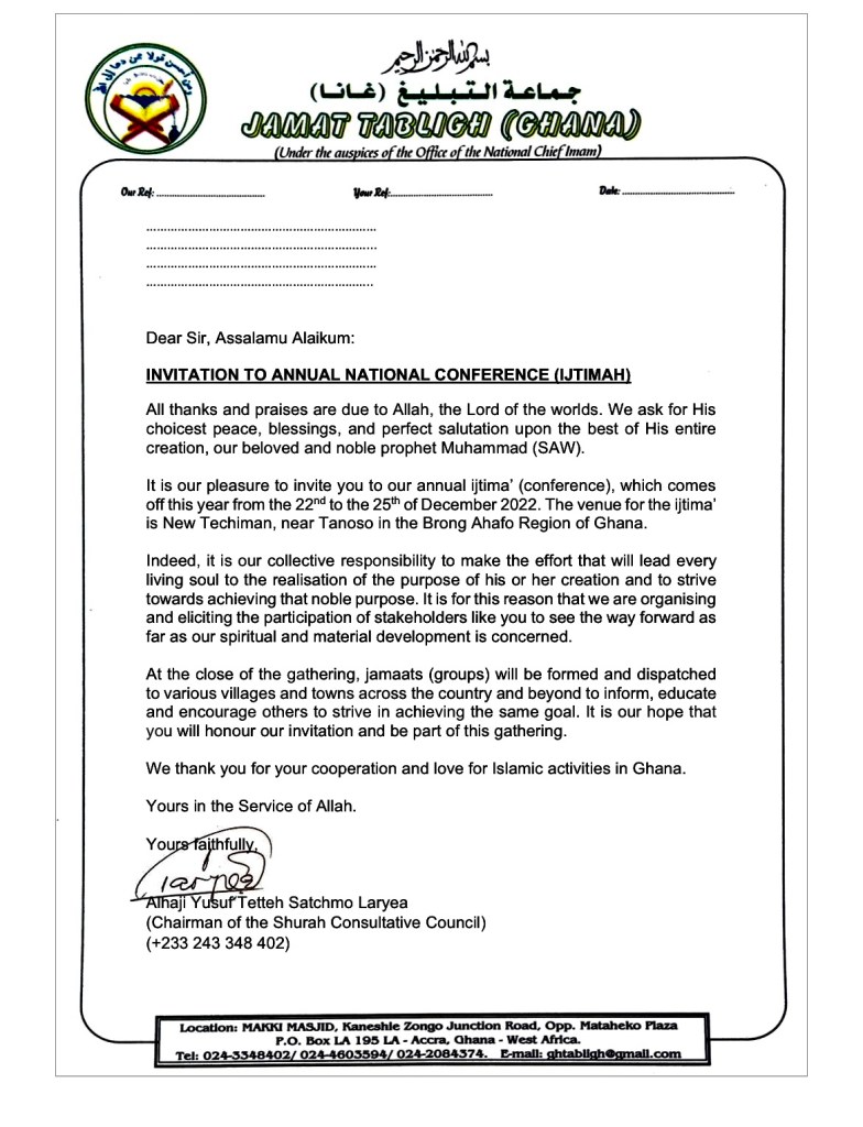Ghana upcoming Ijtema, under the guidelines of World Markaz Nizamudidin & will be from 22-25 December 2022 InshaAllah. Ghana Shura issued invitation letter for this purposes.