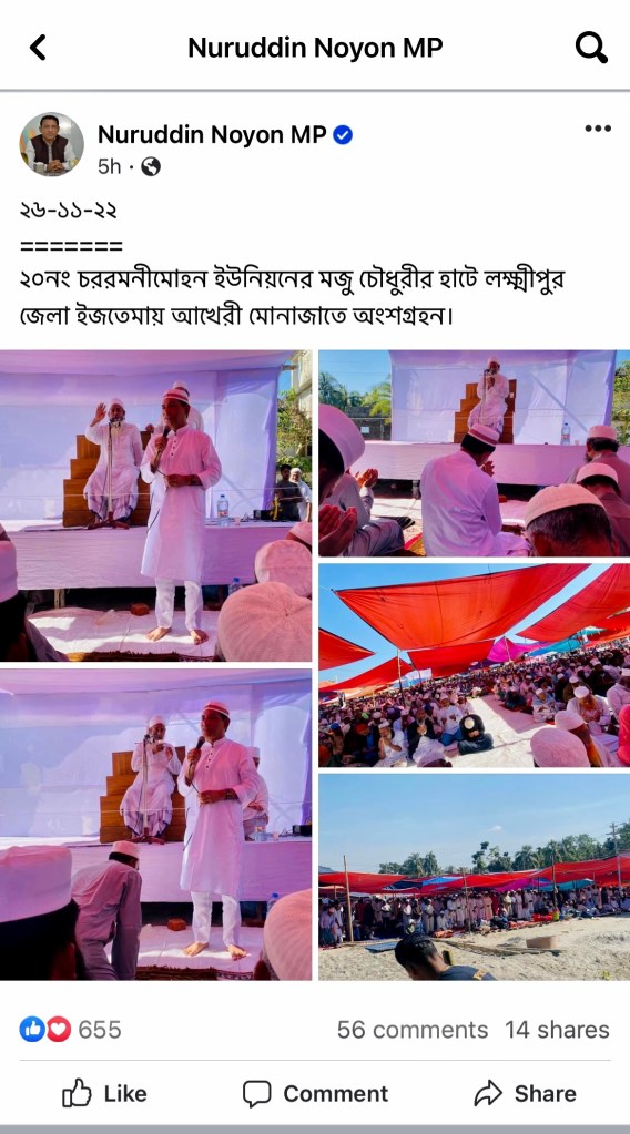 Member of Parliament for Lakshmipur-2 Mr. Nuruddin Chowdhury Noyon MP participated in this Ijtema. Lakshipur Municipal Mayor, Raipur Mayor and many others were also present. 14 ulama including Ameer Zakirul Sahib of neighboring Noakhali Ulama Jamaat participated. Ulama Jamaat of Chittagong also participated. Nuruddin Chowdhury Noyon MP posted the status of this Ijtema on his verified Facebook.