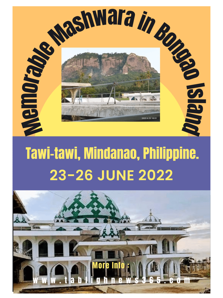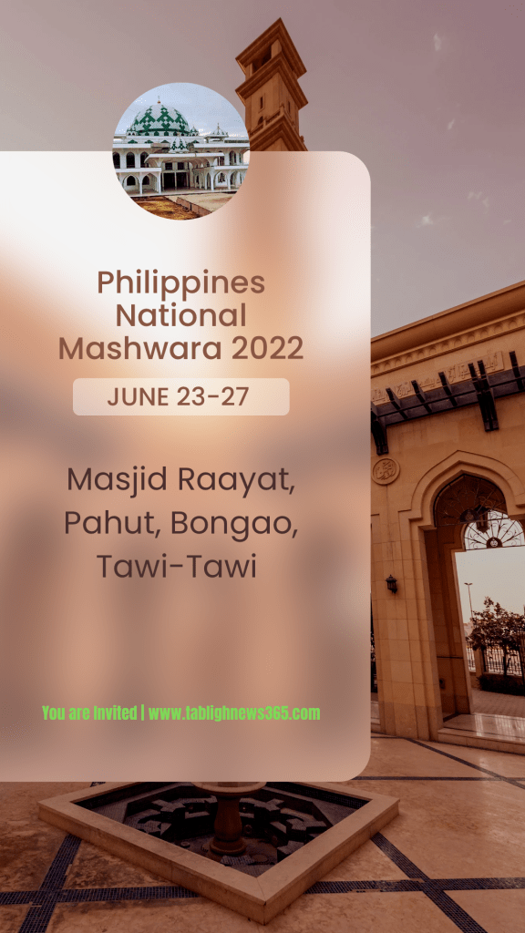 The 4-day Philippine National Mashwara began on June 23, 2022 under the direction of World Markaz Nizamuddin on Bongao Island, the capital of Tawai-Tawai province in the Philippines. Malaysian & Indonesian were here attending Philippine national maswara although there are no Nizamuddin Jamaat but it’s instructed to conduct Amal on this Mashwara by the instructions of World Markaz Nizamuddin, India.