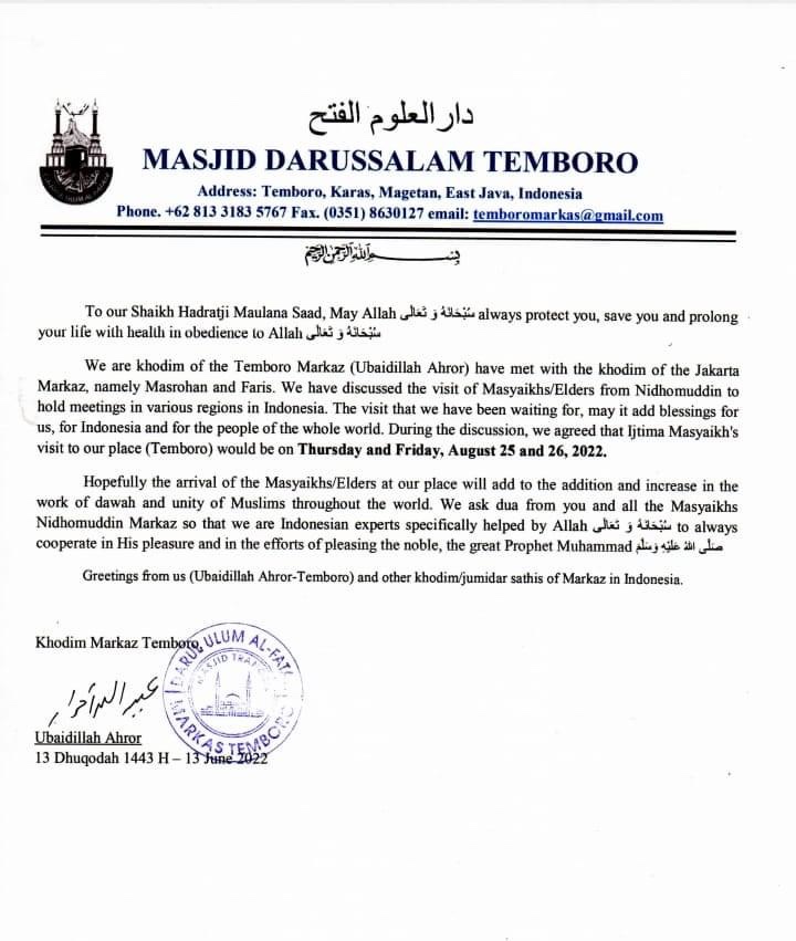 From 21-23rd October, 2022 Hazratji will visit in Temboro, Indonesia InshaAllah. It’s the possible time, it may change. Residents of Temboro, also known as Medina of Indonesia, are eagerly waiting to see Hazratji.