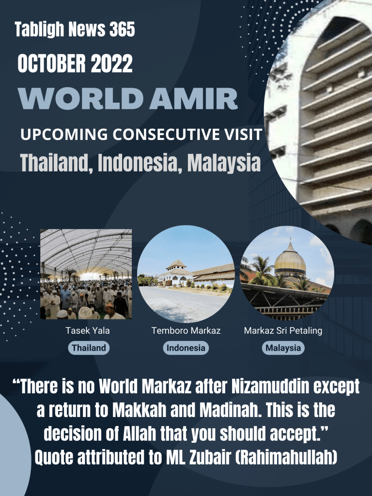 Amir of the World Hazratji Maulana Saad DB, is expected to visit Thailand, Indonesia and Malaysia consecutively in the middle of next October 2022, InshaAllah.
