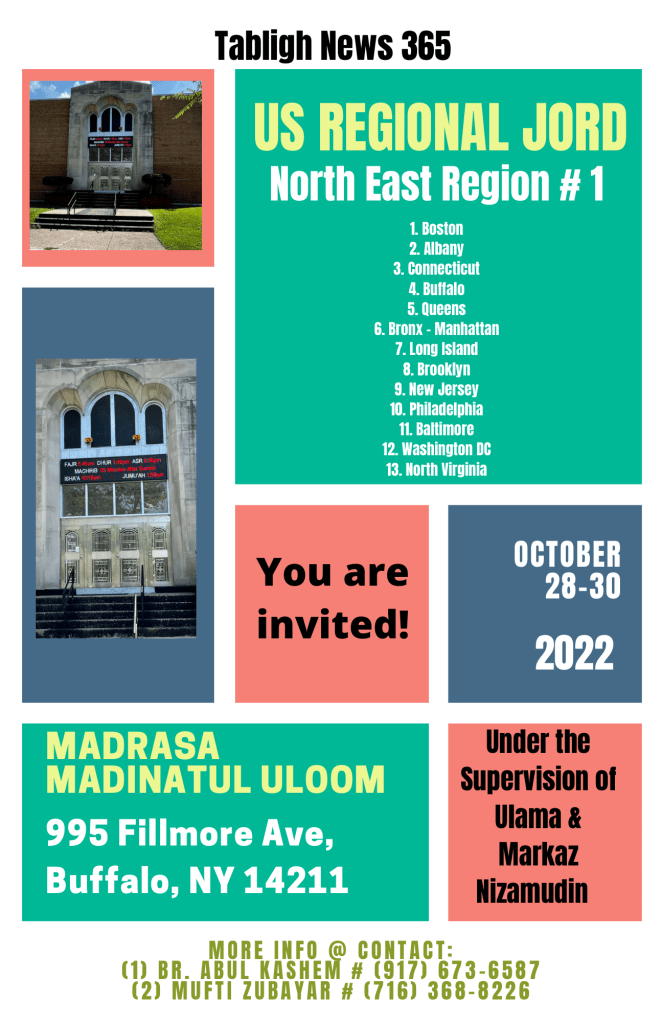 Alhamdulillah, Today’s morning The World Capital City New York ended its 3 days Annual Ijtema with final dua. The 3-day Ijtema was held in the most extensive borough of New York City. More than 500 people were in attendance. Ulama Jamaat from Nizamuddin(India), Indonesia, Canada and Bangladesh participated in the Ijtema. Local USA Ulama also participated in this Ijtema. 11 (eleven) 40 days Jammat came out for kuruz fisa sabilillah. At the Ijtema, a white non-Muslim recited the Kalema and converted to Islam.