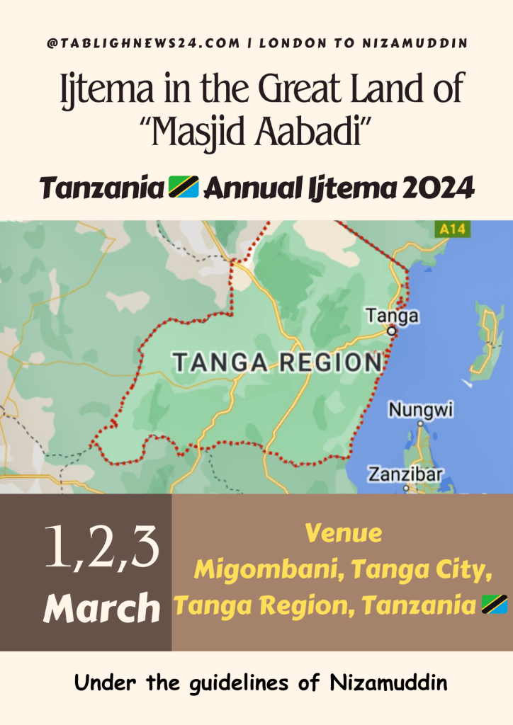 (1) Our Akabir Maulana SHAMIM db with his Jammat will arrive at Main Markaz Kiwalani, Tanzania on 20th January 2024. There will be Jord for Juhud before Ijtema on 21st January 2024, Asr to Isha In’shaa’Allah.