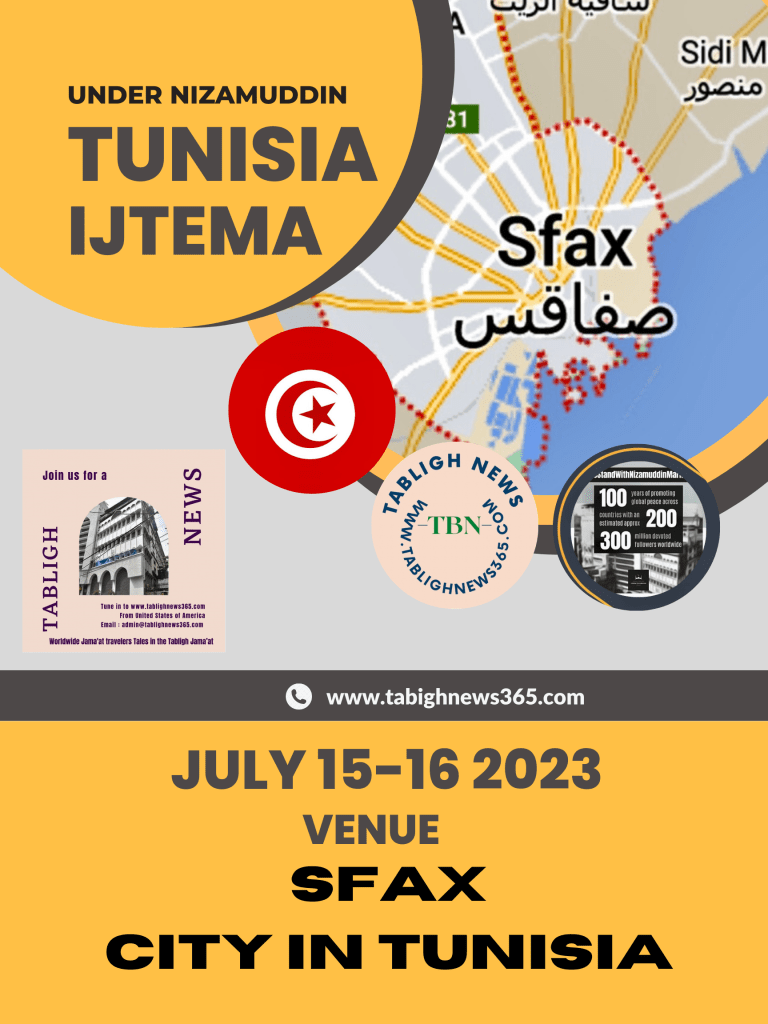 Alhamdulilla. Tunisia the Country in North Africa’s Annual Ijtema begins today & ends on tomorrow on July 16, 2023 at Sfax City in Tunisia, under the guidelines of World Markaz Nizamuddin. Jammat from Malaysia, Algeria & Qatar are participating. Arabic is the official language of Tunisia & majority following the World Markaz Nizamuddin. It’s one of the July 2023 Ijtema. May Allah SWT accept & bless. Ameen.