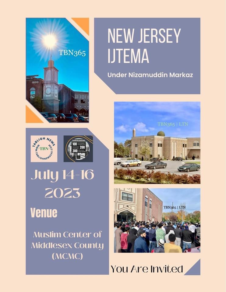 Alhamdulillah by the Fazal of Allah Subhana wata’aala American New Jersey Halaqa Annual Ijtema will commence from July 14-16 2023 at Muslim Center of Middlesex County (MCMC), under the guidelines of World Markaz Nizamuddin. It will be small gathering. May Allah SWT accept & bless. Ameen.