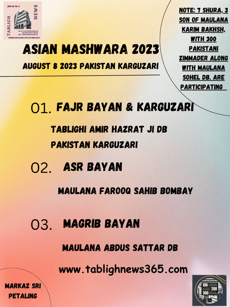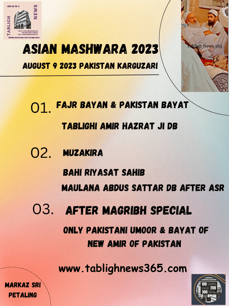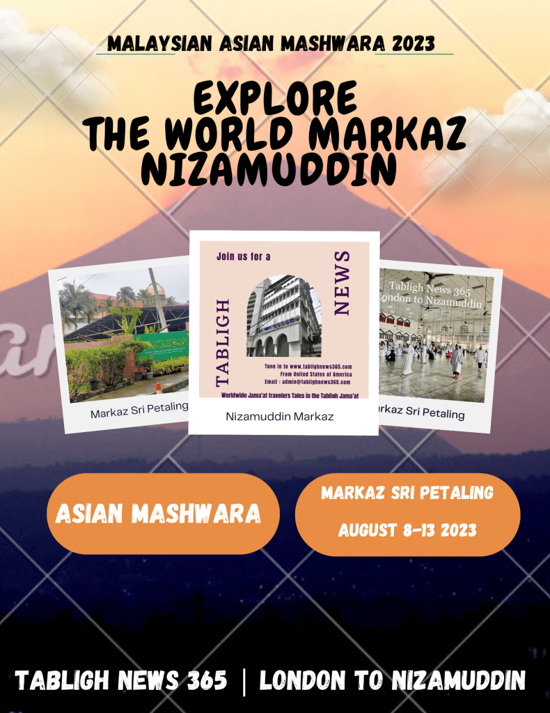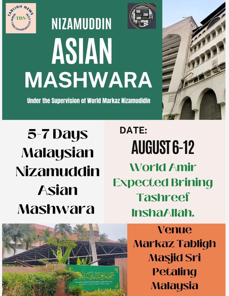 We are very Glad to inform you that with the infinite help & Tawfiq of Allah Subhana wata’aala another international gathering “Asian Mashwara” under the guidelines of World Markaz Nizamuddin begins tomorrow on August 8, 2023 & ends on August 13, 2023 InshaAllah at Markaz Sri Petaling, Malaysia.